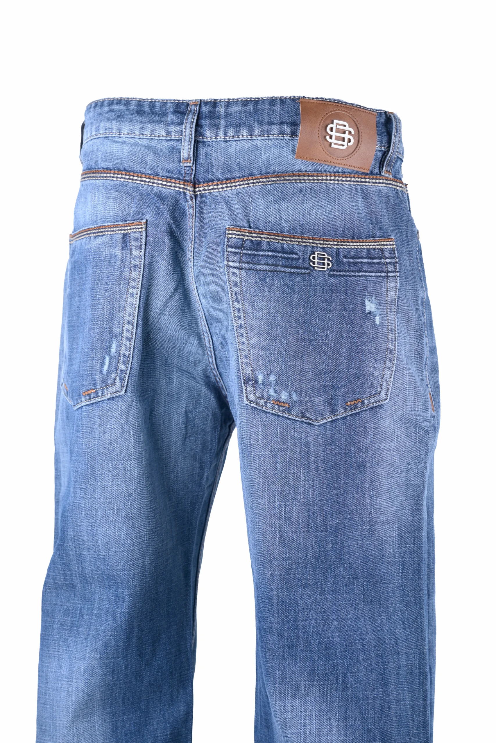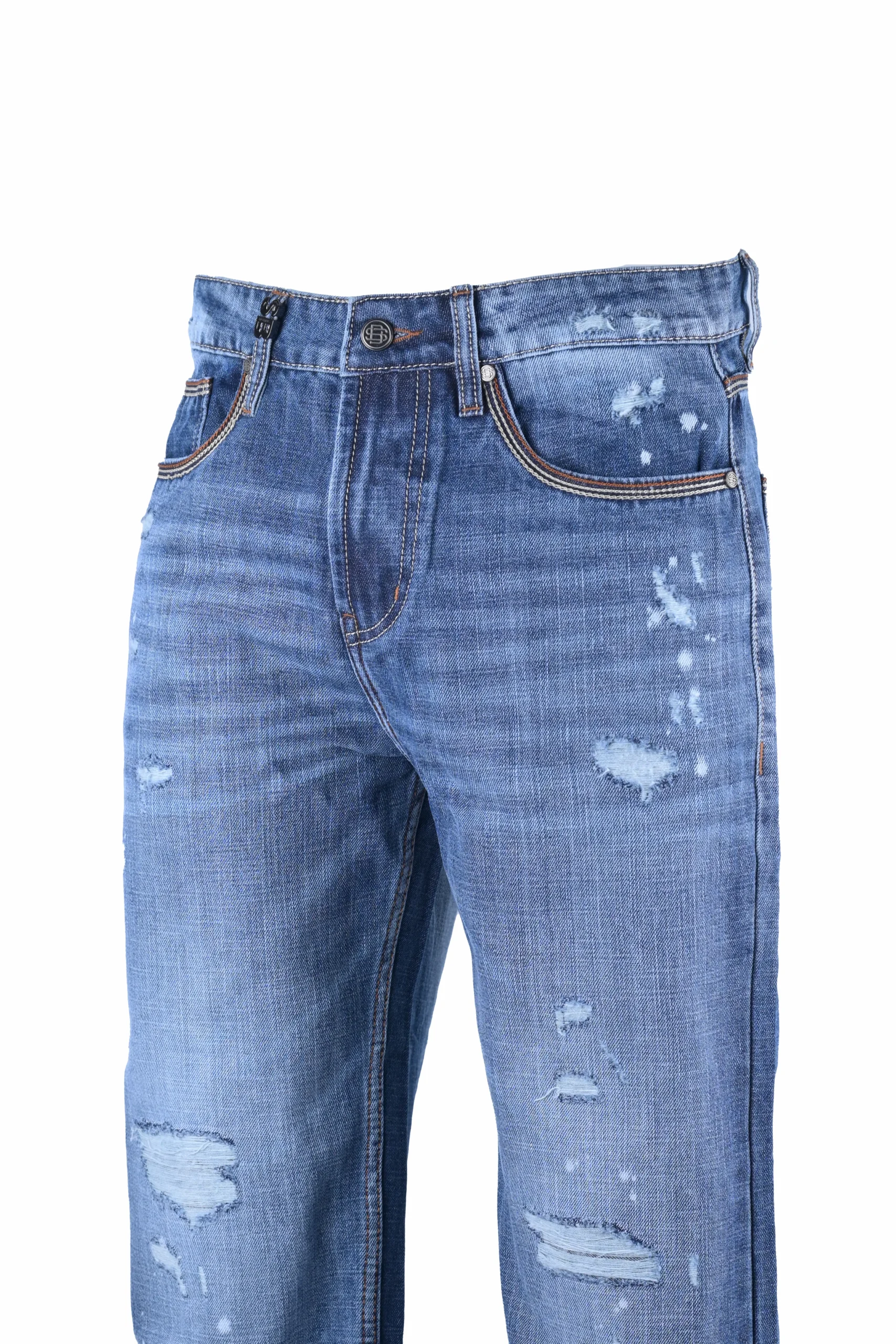 These men’s distressed straight-leg jeans feature a classic blue denim wash with a modern twist. The jeans are designed with intentional fading and whiskering on the thighs and knees, giving them a stylish, worn-in look. Distressed details, including small rips and abrasions, add a rugged edge to the overall design. The jeans come with a traditional five-pocket styling, belt loops, and a button fly closure. Perfect for casual outings, these jeans offer both comfort and a trendy appearance.